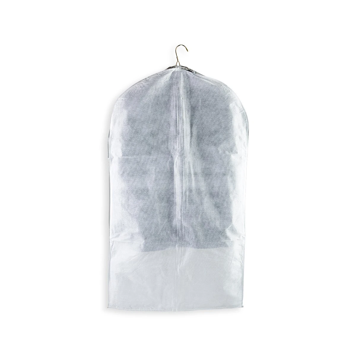 Let fresh air in while you keep dust, mildew and moths out with these breathable garment bags. The back side of the bag is made with white non-woven breathable material, while the front side is made of clear vinyl with a white plastic zipper. Available in a variety of sizes. 12 per package. Front of bag is made of clear vinylBack of bag made from non-woven breathable materialWhite zipper down frontKeeps dust, mildew and moths out