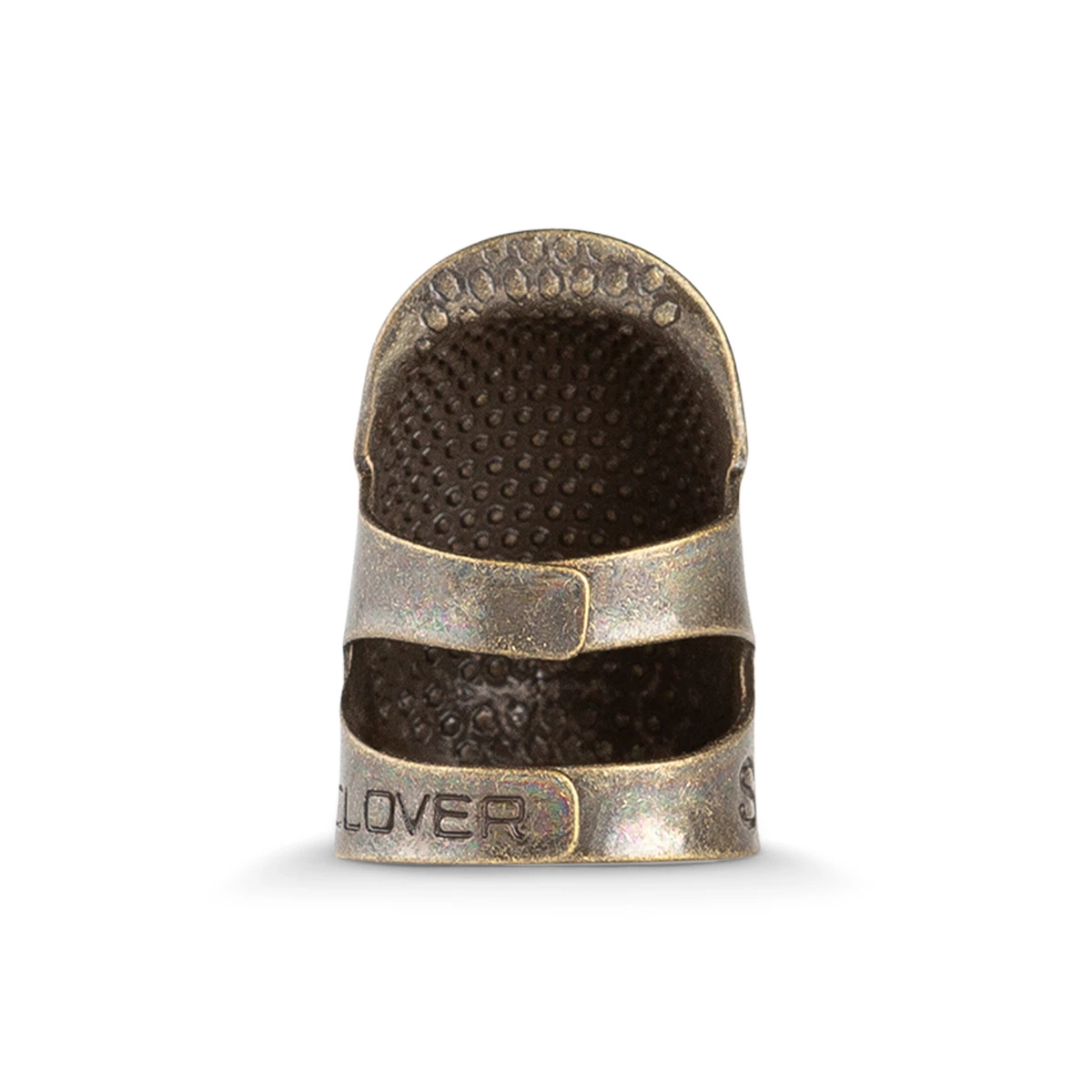 The Clover Open Sided Thimble fits your finger comfortably. This brass thimble is designed with an open top to keep your finger from perspiring. Features dimples for easy use on needles. Available in a variety of sizes. Adjustable for a comfortable fit. Please use caution as the needle may slip depending on the angle. Made from brassSuited for people with long fingernailsKeeps finger coolDimples for easy use on needlesAdjustable comfortable fit