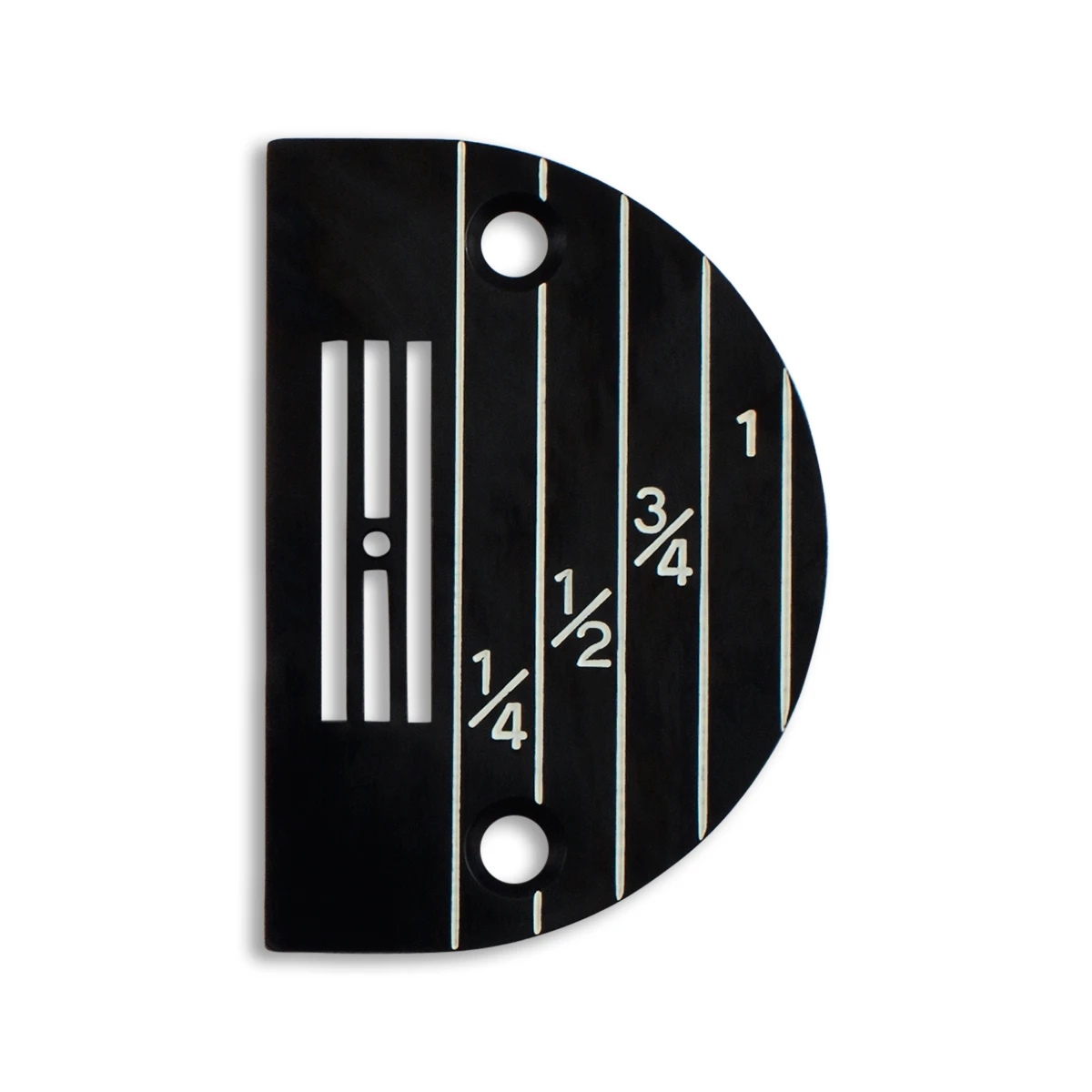 The regular needle plate with line gauge mounts to the base of a sewing machine to display different sewing widths. Use with single needle drop feed lockstitch machines. Fits various Singer models.