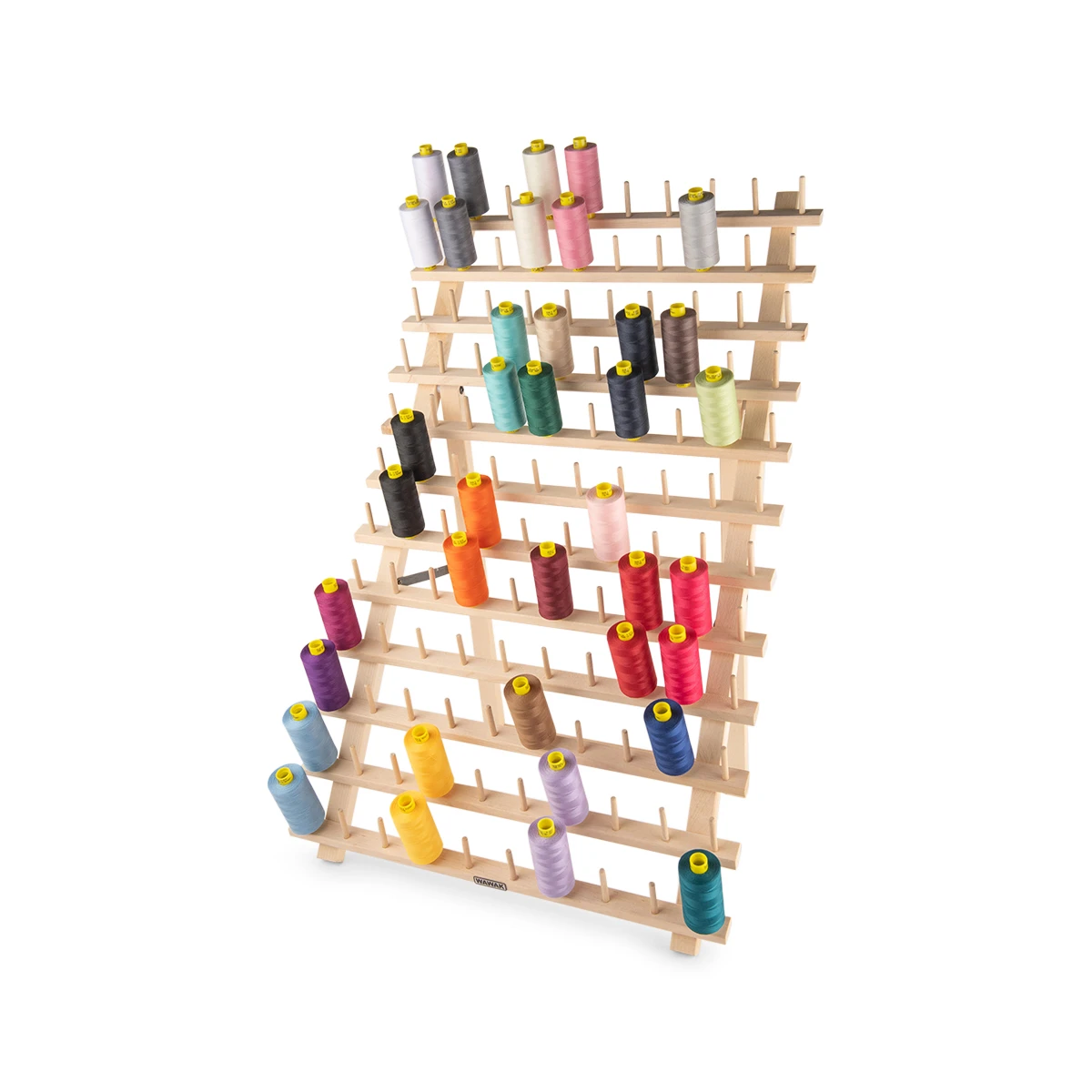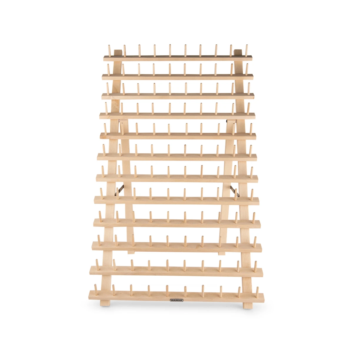 The WAWAK 120 spool thread rack accommodates up to 120 standard sized spools. To be used on table top with included legs. Features 1 1/4” pegs spaced 1 3/8” apart with overall dimensions of 15 3/4″ (W) x 26 1/4″ (H). Crafted from unstained birch wood with hanging clips on the back rails for wall-mounting. Legs included for tabletop useCrafted from unstained birchKeep thread organizedHolds up to 120 spoolsIncludes hanging clips for wall-mounting