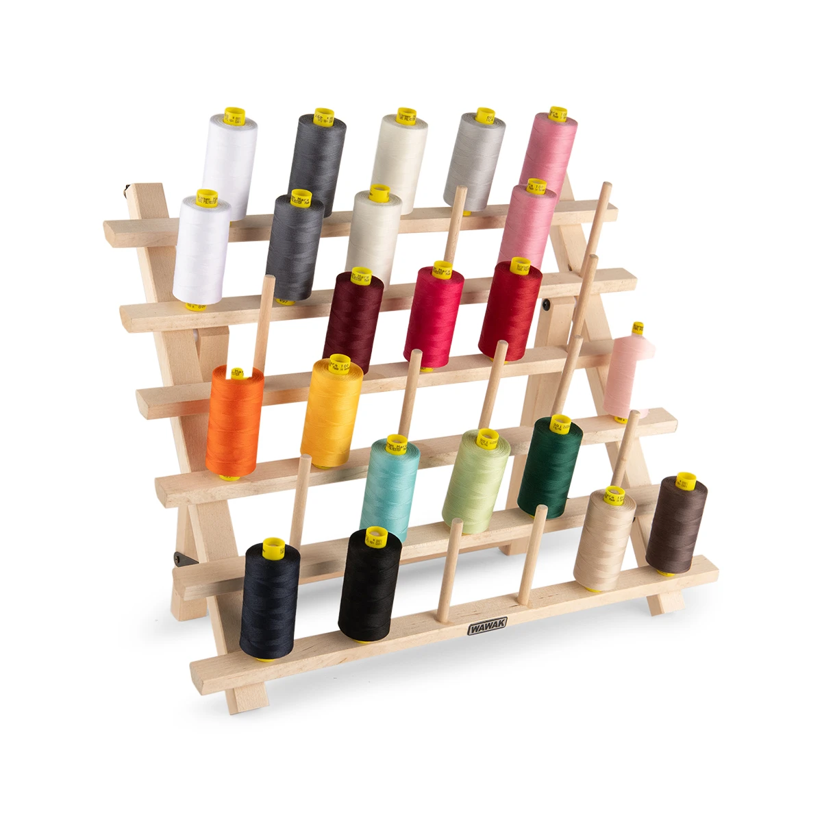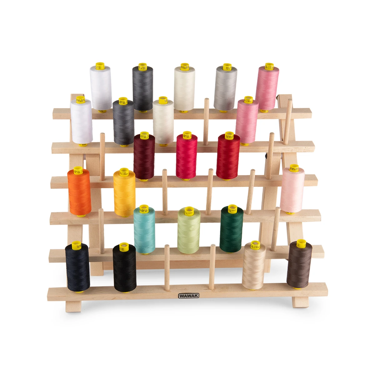 The WAWAK 33 spool thread rack holds 33 standard sizes thread cones. To be used on table top with included legs. Features 2 3/4โ pegs spaced 2 1/8โ apart with overall dimensions of 15 3/4″ (W) x 13 3/8″ (H). Crafted from unstained birch wood with hanging clips on the back rails for wall-mounting. Legs included for tabletop useCrafted from unstained birchKeep thread organizedHolds up to 33 spoolsIncludes hanging clips for wall-mounting