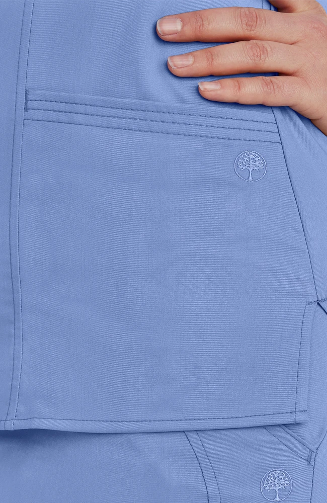 This modern fit crossover scrub top from Healing Hands Purple Label features an ultra-lightweight breathable stretchy fabric. This scrub top has princess seams and front darts for a flattering fit. It has triple needle stitching at the pockets and neck, side vents, two patch pockets, and tonal logo embroidery at back neck. Healing Hands Purple Label stretch fabric is a finely woven ploy, rayon and spandex blend with true wash and wear performance. It resists wrinkles and drapes beautifully all day long.
